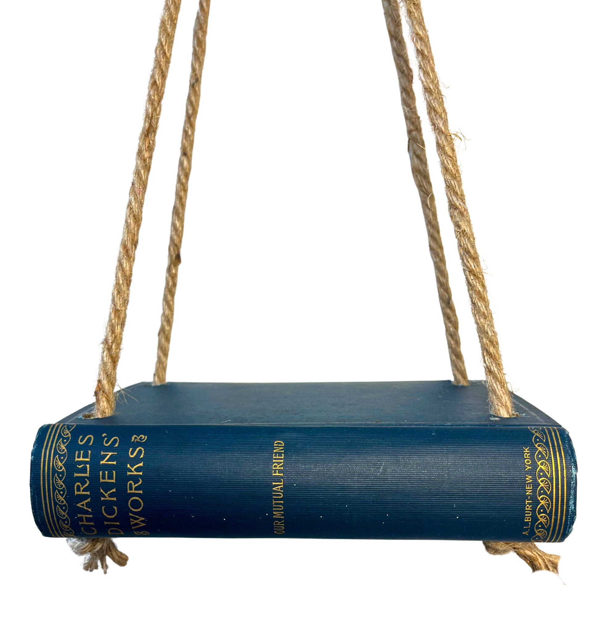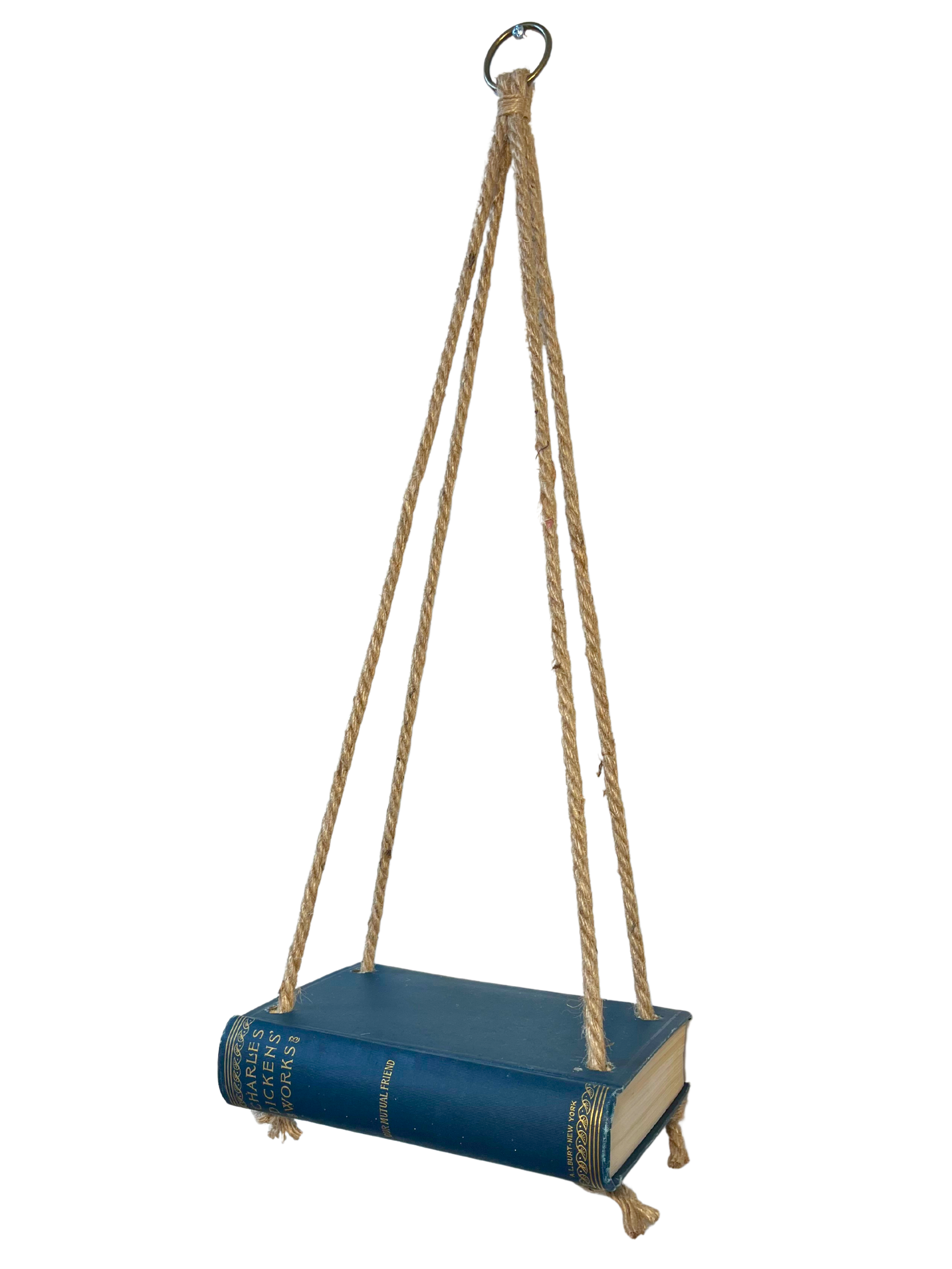 Display your treasures with this charming hanging shelf crafted from a vintage Charles Dickens with gold lettering. Suspended by natural jute rope. Each piece is uniquely handmade, so while you'll receive a book from the same series, yours will have its own distinctive personality.