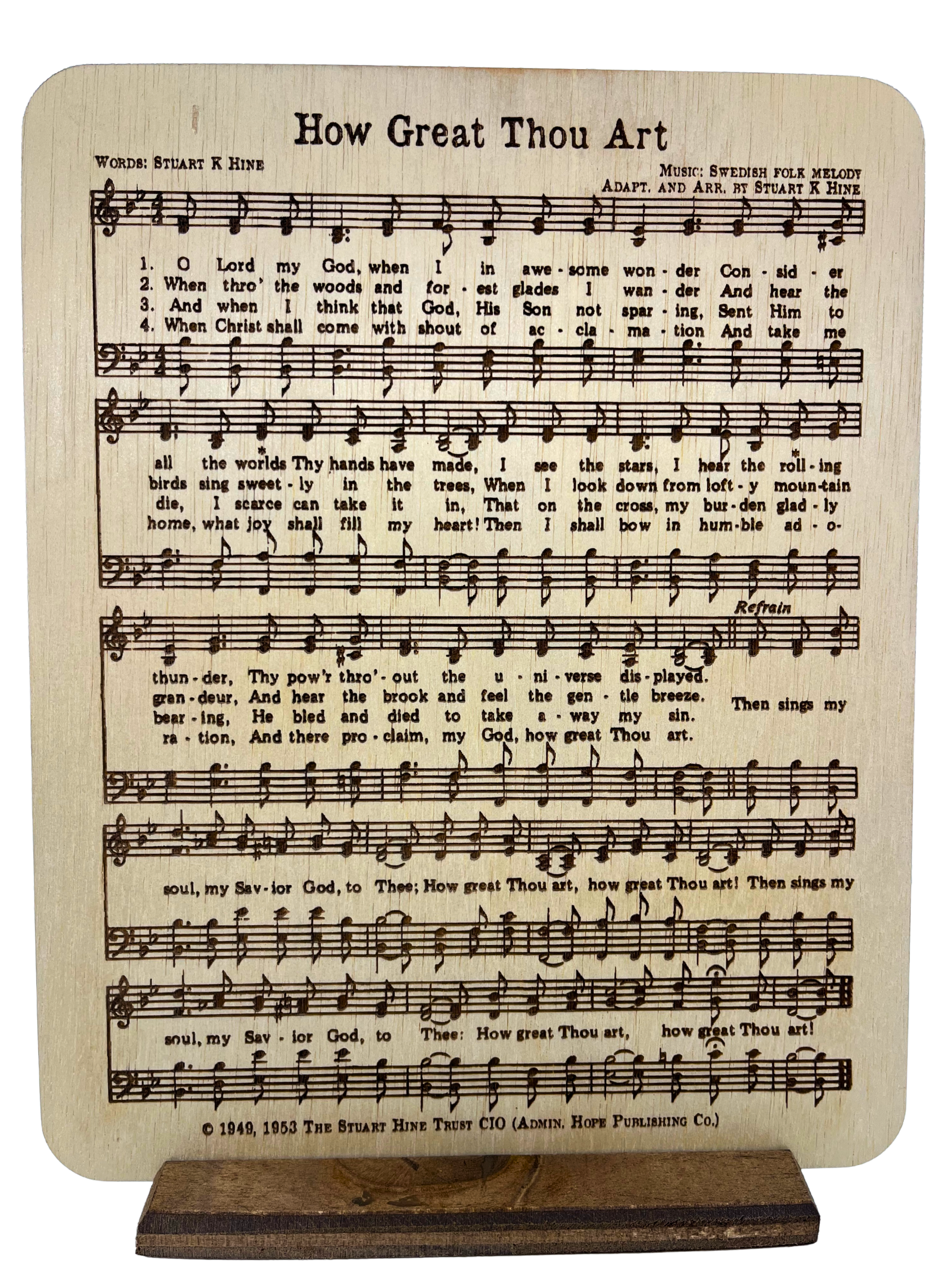 A charming wooden display piece featuring the beloved hymn, "How Great Thou Art", beautifully engraved onto an 8x10 board with smooth, rounded edges. Comes ready with a stand.