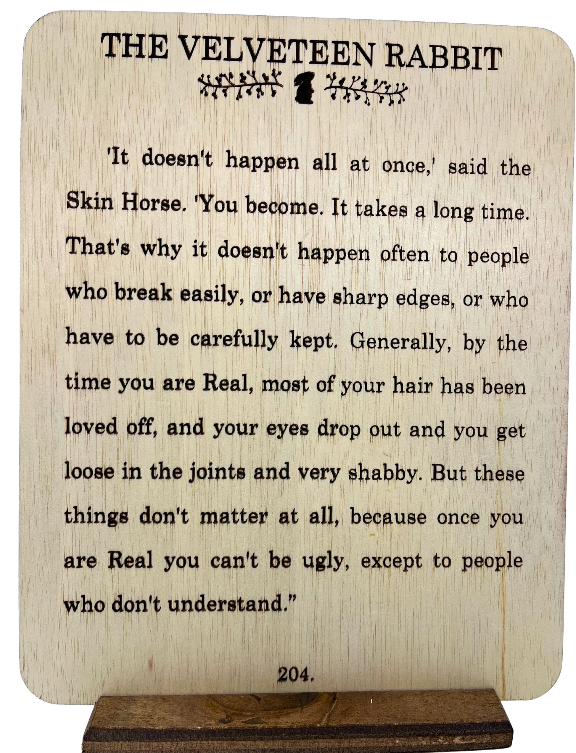A charming wooden display piece featuring the beloved Velveteen Rabbit quote, beautifully engraved onto an 8x10 board with smooth, rounded edges. Comes ready with a stand, bringing a touch of literary warmth to your space.