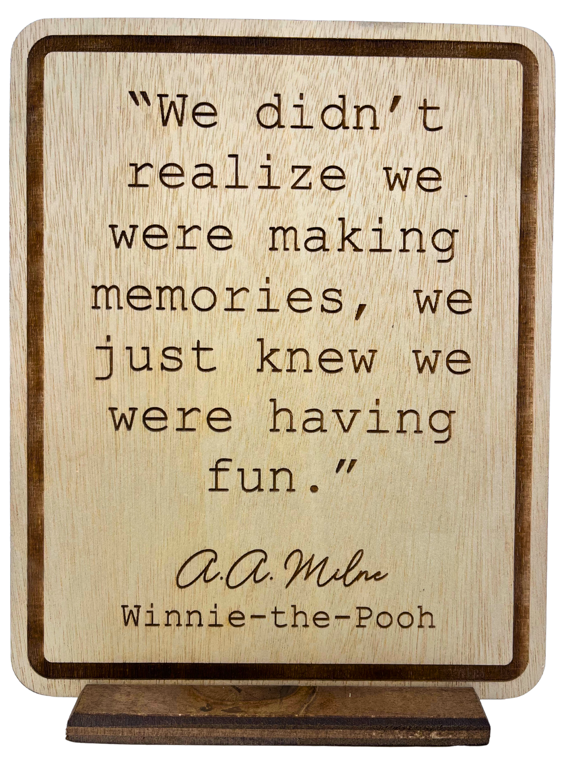A charming wooden display piece featuring the beloved Winnie-the-Pooh quote, beautifully engraved onto an 8x10 board with smooth, rounded edges. Comes ready with a stand, bringing a touch of literary warmth to your space.