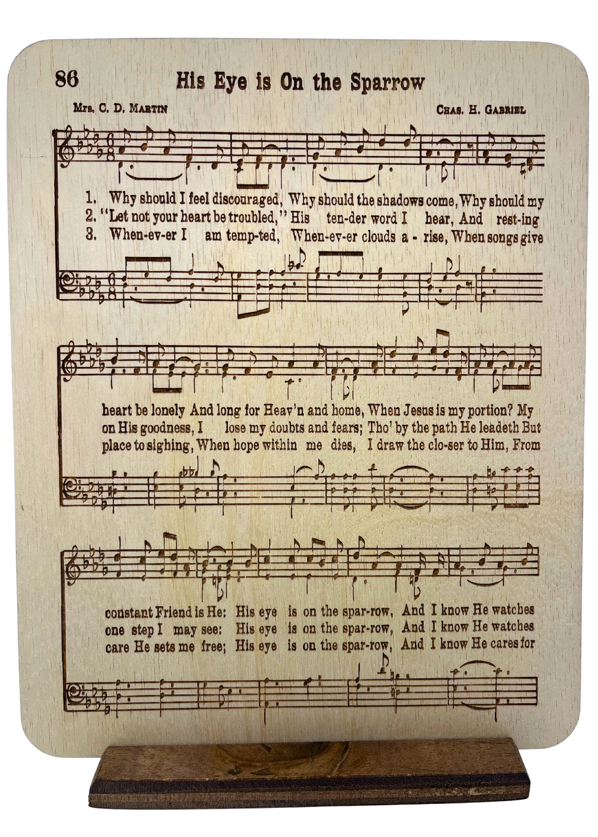 A charming wooden display piece featuring the beloved hymn, "His Eye is on the Sparrow", beautifully engraved onto an 8x10 board with smooth, rounded edges. Comes ready with a stand.