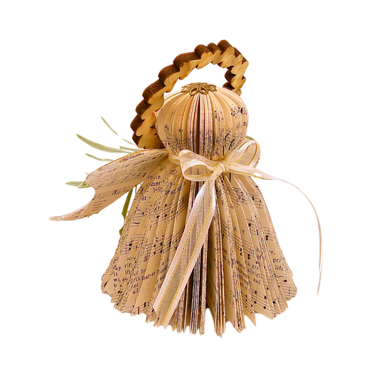 This angel is crafted from a vintage hymn book, featuring a wood-burned halo and adorned with delicate ribbon and floral accents, making it a charming and meaningful decoration.