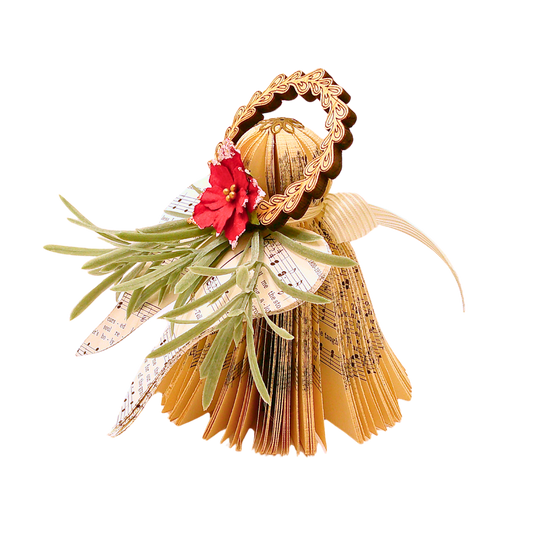 This angel is crafted from a vintage hymn book, featuring a wood-burned halo and adorned with delicate ribbon and floral accents, making it a charming and meaningful decoration.