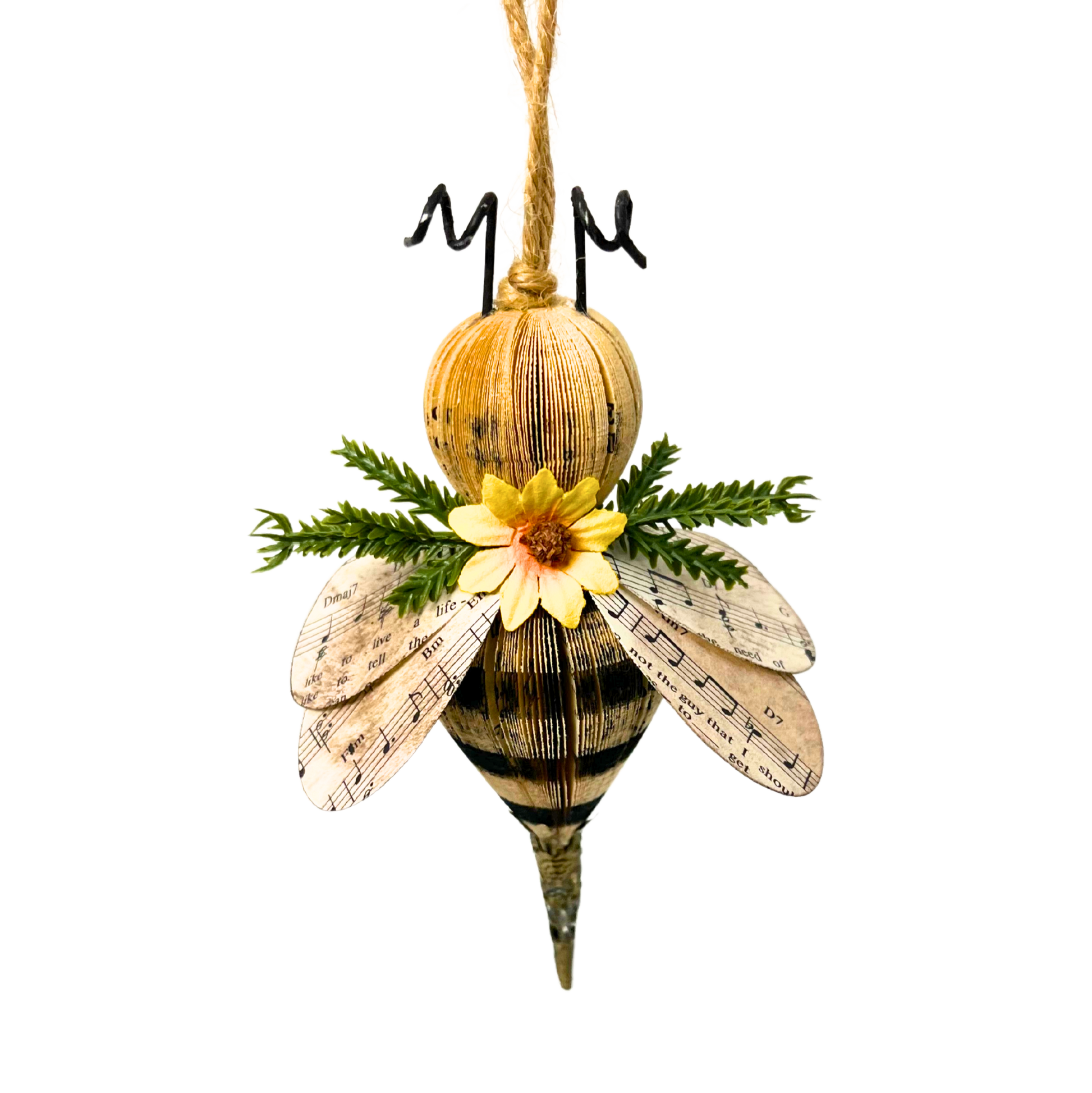 Celebrate nature's pollinators with this delightful bumblebee ornament crafted from vintage book pages. Adorned with greenery and cheerful flowers, it brings whimsy and literary charm to any space. Handmade with care, each bee has its own personality and character.