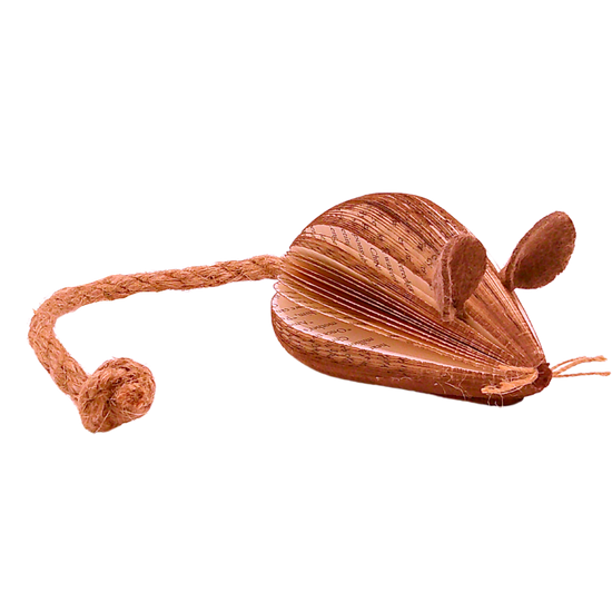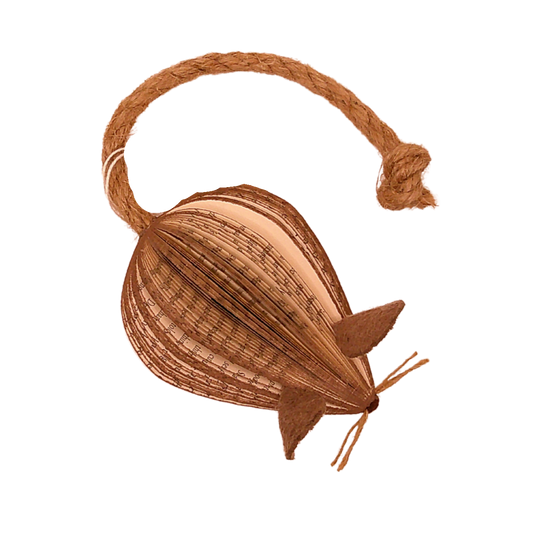 This charming gray-brown mouse is crafted from a book, featuring a distinctive jute rope tail. Its unique design makes it a delightful addition to any space, blending literary charm with handcrafted appeal.