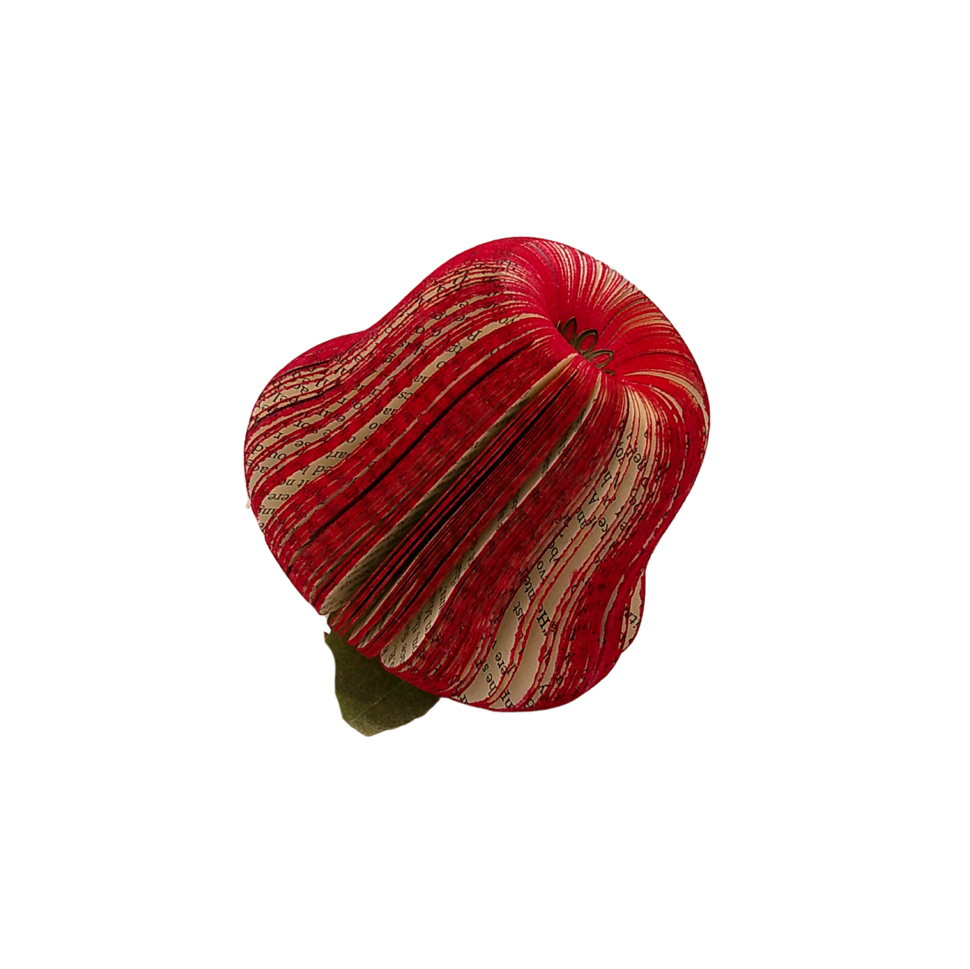 Discover the charm of a red apple crafted entirely from book pages, blending creativity with a unique decorative touch.